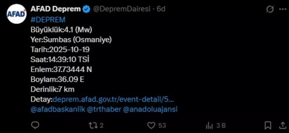 Afet ve Acil Durum Yönetimi Başkanlığı (AFAD) verilerine göre, Osmaniye’nin Sumbas ilçesinde saat 14.39’da 4.1 büyüklüğünde bir Deprem meydana geldi. Depremin yerin 7 kilometre derinliğinde gerçekleştiği bildirildi.