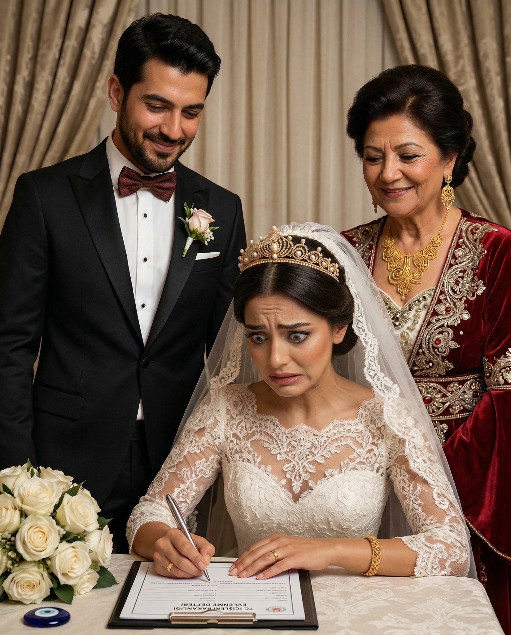 “Elif bunu imzalamadan bu aileye gelin olamaz,” dedi. Salonda fısıldaşmalar başladı. Kerem ayağa kalktı. “Anne, bu yaptığın çok yanlış.” Nermin Hanım sertçe cevap verdi: “Yanlış değil, tedbir.” Sonra Elif’e dönüp ekledi: “Eğer niyetin temizse imzalamakta sorun yaşamazsın.”