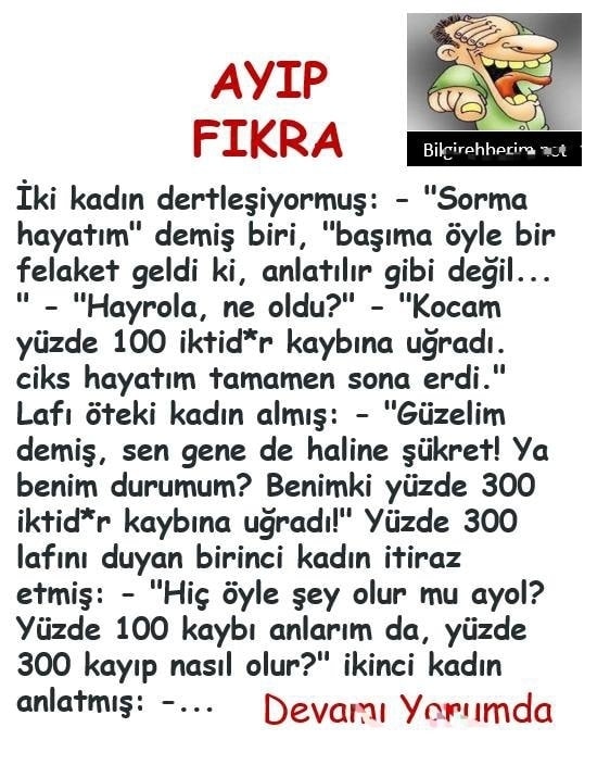 iki kadın dertleşiyormuş: – “Sorma hayatım” demiş biri, “başıma öyle bir felaket geldi ki, anlatılır gibi değil… ” – “Hayrola, ne oldu?” – “Kocam yüzde 100 iktid*r kaybına uğradı. ciks hayatım tamamen sona erdi.” Lafı öteki kadın almış: – “Güzelim demiş, sen gene de haline şükret! Ya benim durumum? Benimki yüzde 300 iktid*r kaybına uğradı!” Yüzde 300 lafını duyan birinci kadın itiraz etmiş: – “Hiç öyle şey olur mu ayol? Yüzde 100 kaybı anlarım da, yüzde 300 kayıp nasıl olur?” ikinci kadın anlatmış: …