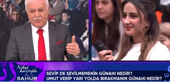 Nihat Hatipoğlu’na ilk sahurda gelen soru sosyal medyada gündem oldu! “Umut verip…” Ramazan ayı boyunca milyonları ekran başına kilitleyen Nihat Hatipoğlu ilk sahur programını yaptı. ATV’de her yıl ekrana gelen Prof. Dr. Nihat Hatipoğlu’na her yıl gelen sorular gündem oluyor. Bu yıl ekranda olan Nihat Hatipoğlu’na yine çeşitli sorular yağdı. Genç bir kadın ünlü ilahiyatçıya sahurda “Sevip de sevilmemenin günahı nedir? Umut verip de yarı yolda bırakmanın günahı nedir” diye sorunca sosyal medyada gündem oldu. “KAPRUZ DEĞİL HOCAM…” Nihat Hatipoğlu bu soruya “Kötü niyetle başlanmışsa umut verdiyse günahtır. Ama iyi niyetlidir bakar karakterde farklılıklar vardır senin yolun sana benimki bana diyorsa problem yok. İstismar etmek niyetiyle ise günahtır. Öyle ise uzak dur, gerçi ‘karpuz değil hocam içini göremiyorum’ diyeceksin… Ama bence bir görüşmede bile birkaç soruda insanların karakterini anlamaktazorlanmazsınız” yanıtını verdi. Bir günde harcadığı para şoke etti! “Çok çalışıyorum…” Genç kadının sorusu sosyal medyada defalarca kez paylaşıldı ve “Aşkolog Nihat Hatioğlu”, “Konuş hocam kızın içi yanmış”, “En çok merak ettiğim soru gelmiş” yorumları yapıldı